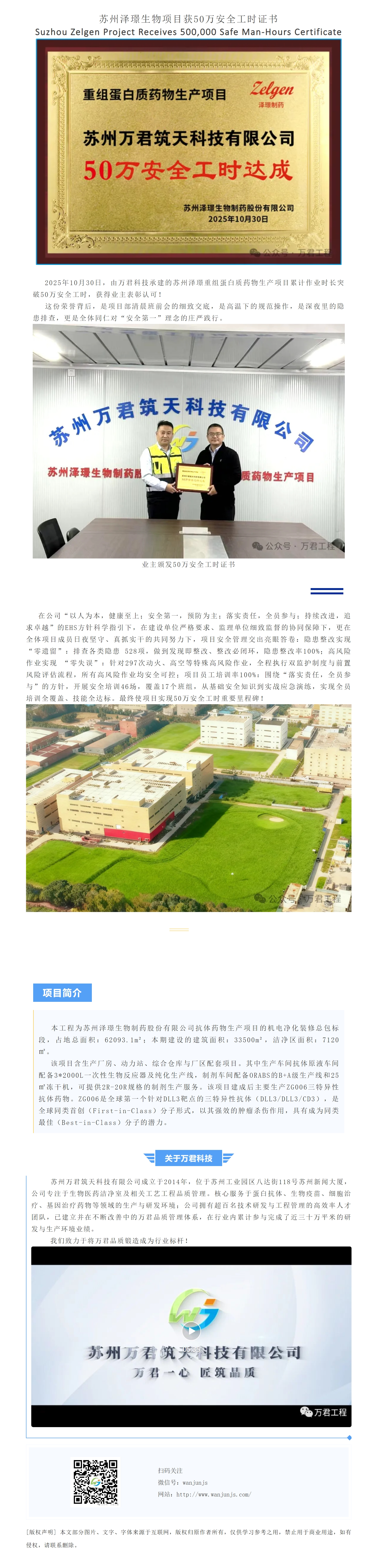 蘇州澤璟生物項(xiàng)目獲50萬安全工時(shí)證書