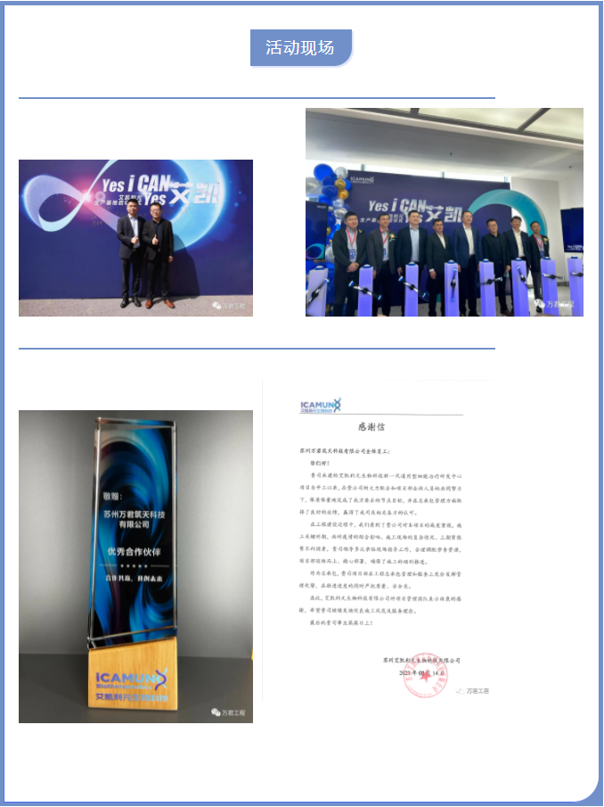 由蘇州萬君筑天科技承建的艾凱利元生物科技新一代通用型細胞治療研發(fā)中心項目于2022年9月竣工交付。本項目執(zhí)行過程包含深化設計、BIM空間管理、設備采購、工程施工、系統調試、(BMS、EMS)驗證等階段。萬君科技秉承著聚賢、謙謹、革新、責任的經營理念,經過105日歷天達成竣工條件,克服了新冠疫情停工和夏日極端天氣等困難,高質量建成了GMP生產基地,包括一條采用蜂巢培養(yǎng)系統實現多批次細胞培養(yǎng)灌裝的生產線,一個基于多功能干細胞(iPSC)的通用型細胞治療藥物開發(fā)實驗室。