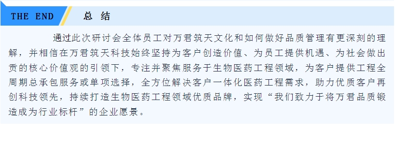 為持續(xù)提升項(xiàng)目管理能力、提高團(tuán)隊(duì)?wèi)?zhàn)斗力,進(jìn)而提升公司品質(zhì)管理能力,2023年7月15日,萬(wàn)君全體員工開(kāi)展了《工程項(xiàng)目管理能力與品質(zhì)提升》研討會(huì)。